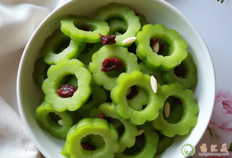 苦瓜甙和苦味素能增進食欲,健脾開胃,有明目、助消化、清涼解毒、利尿等療效。苦瓜中維生素C含量很高,是柑橘的兩倍多,能中斷黑色素生成的過程,干擾黑色素的生物合成,有效對抗黑色素,防治色斑。