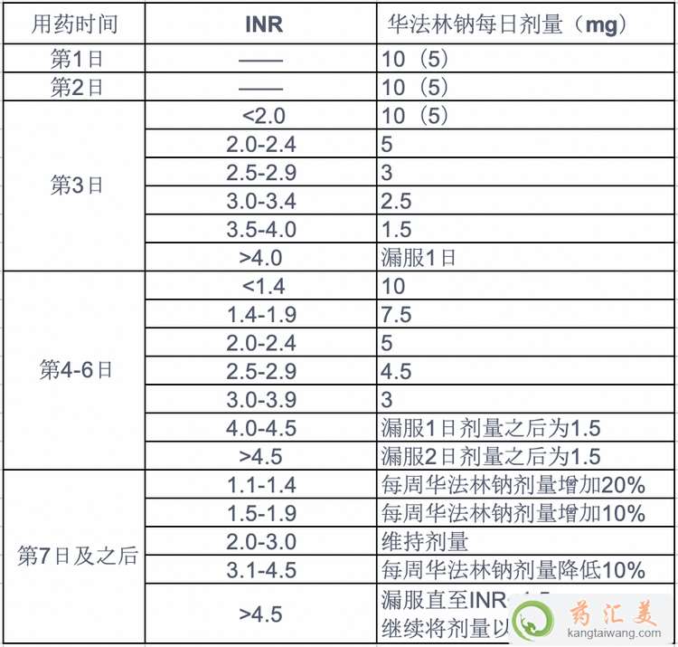 3、對于老年患者、體型較小、自然INR高于1.2或患有其他疾病(詳見用藥前須知)或正服用其他可影響抗凝治療效果藥物的患者(詳見藥物相互作用),推薦連續(xù)前2日開始劑量為5mg,依據(jù)治療第3日患者INR按以下表所列劑量繼續(xù)治療。詳情請遵醫(yī)囑。