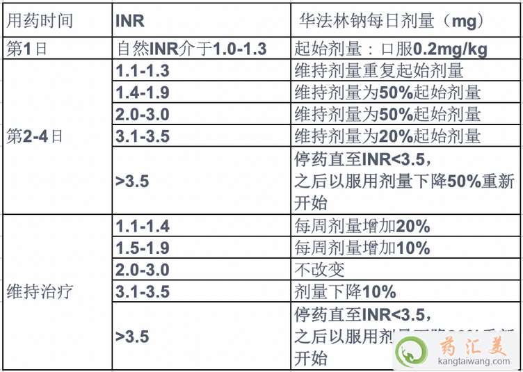 1、正常體重患者及自然INR低于1.2者,在前3日內(nèi)使用10mg華法林鈉治療。依據(jù)治療第4日量度出的INR值按下表所列劑量繼續(xù)治療。詳情請遵醫(yī)。