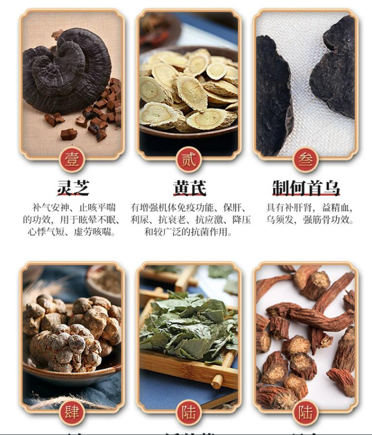【主要成份】靈芝、人參、黃芪、淫羊藿、制何首烏、桑寄生、五味子、三七、丹參。